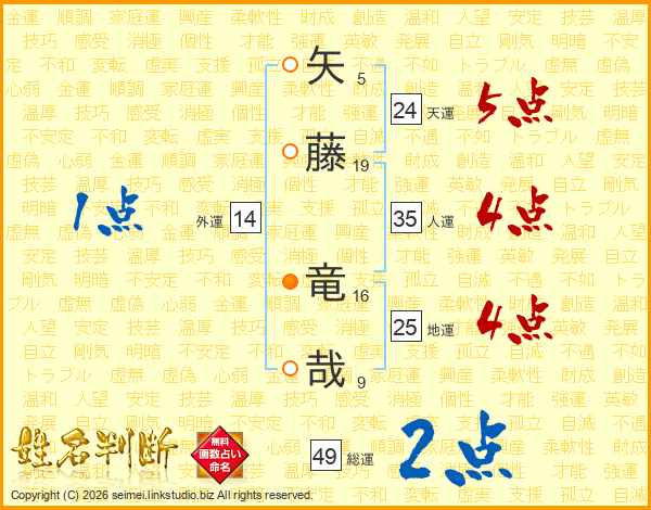 矢藤竜哉さんの総運は49画の2点!
