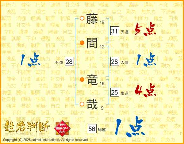 藤(19画)間(12画) 竜(16画)哉(9画)