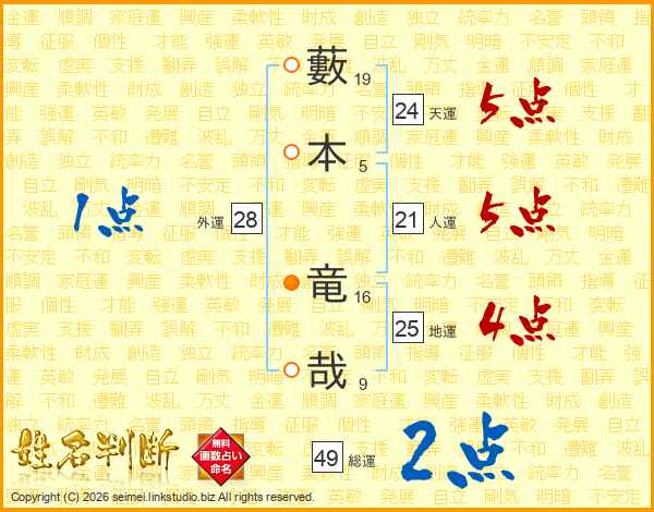 藪本竜哉さんの総運は49画の2点!