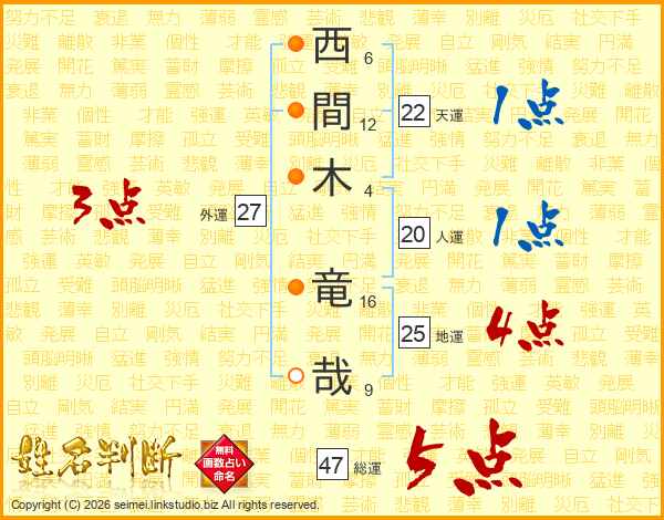 西(6画)間(12画)木(4画) 竜(16画)哉(9画)