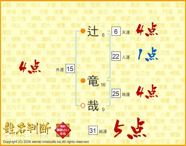 家系が持つ宿命的な運勢を表します。祖先から受け継いだ苗字ですので自分の力が及びません。家柄を象徴します。苗字の合計画数。