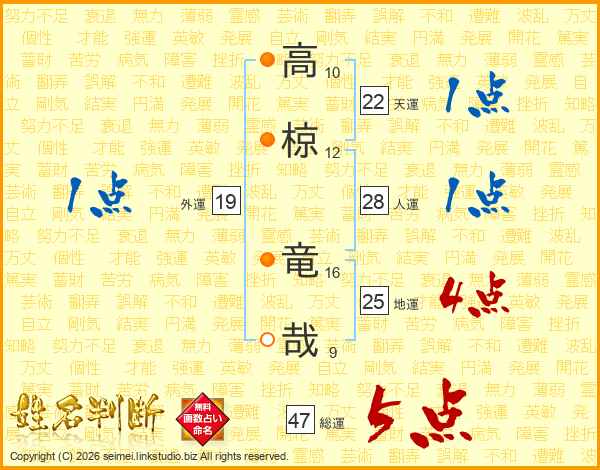高(10画)椋(12画) 竜(16画)哉(9画)