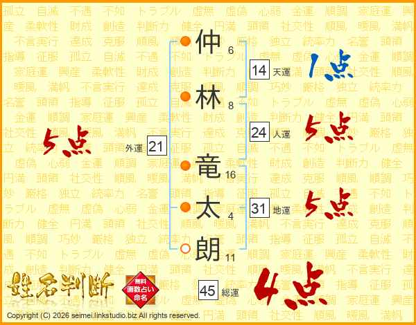 仲(6画)林(8画) 竜(16画)太(4画)朗(11画)