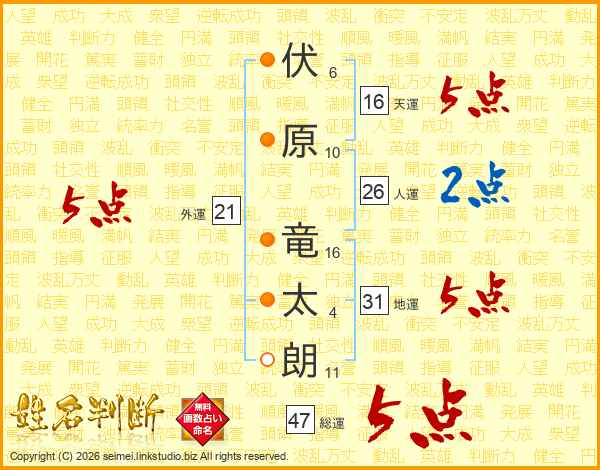 伏(6画)原(10画) 竜(16画)太(4画)朗(11画)