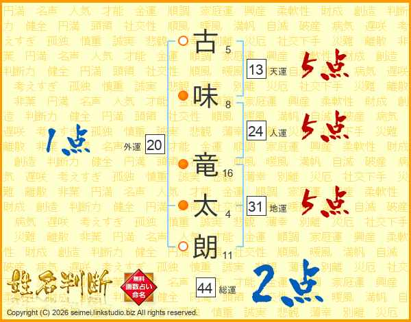 古(5画)味(8画) 竜(16画)太(4画)朗(11画)