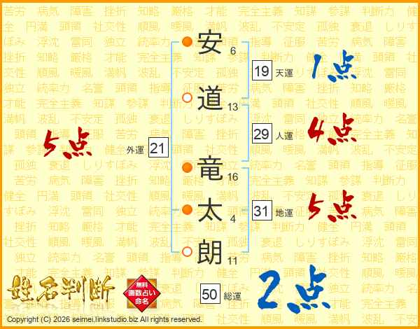 安(6画)道(13画) 竜(16画)太(4画)朗(11画)