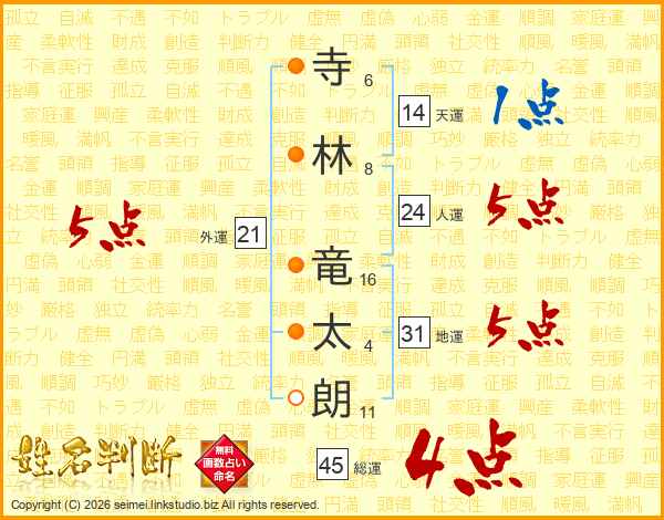 寺(6画)林(8画) 竜(16画)太(4画)朗(11画)