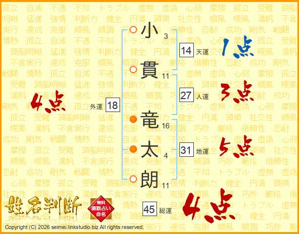 小貫竜太朗さんの総運は45画の4点!