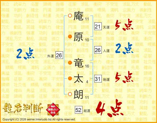 庵(11画)原(10画) 竜(16画)太(4画)朗(11画)