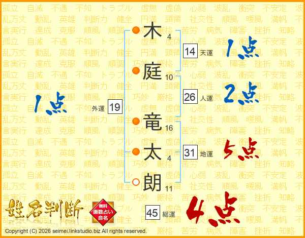 木(4画)庭(10画) 竜(16画)太(4画)朗(11画)