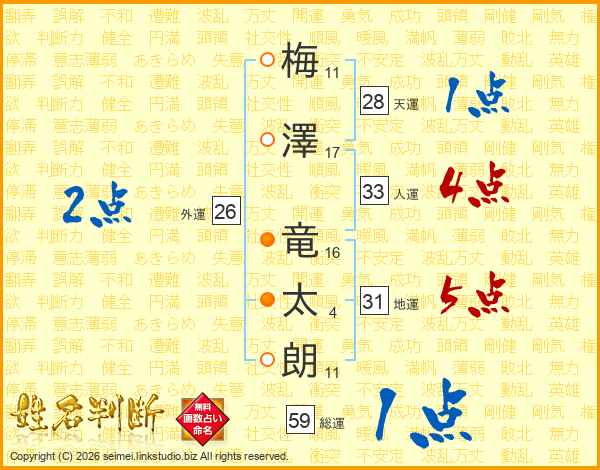梅(11画)澤(17画) 竜(16画)太(4画)朗(11画)