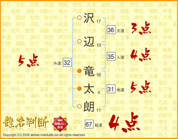 沢(17画)辺(19画) 竜(16画)太(4画)朗(11画)