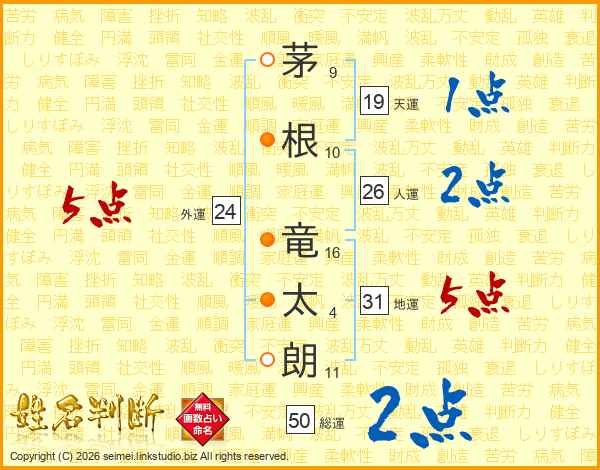 茅(9画)根(10画) 竜(16画)太(4画)朗(11画)
