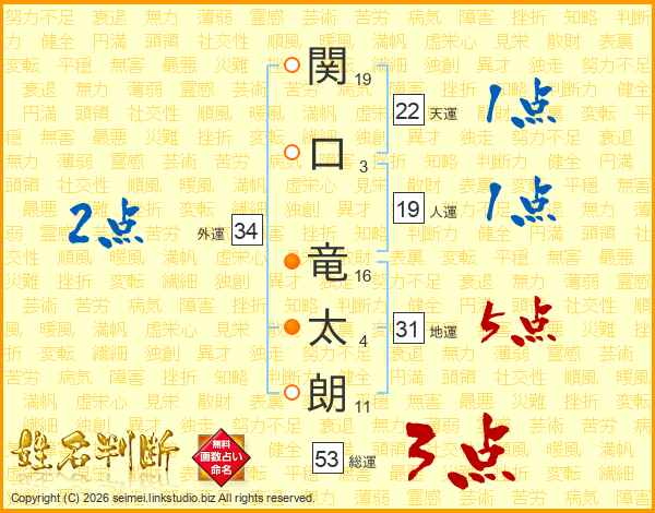 関(19画)口(3画) 竜(16画)太(4画)朗(11画)