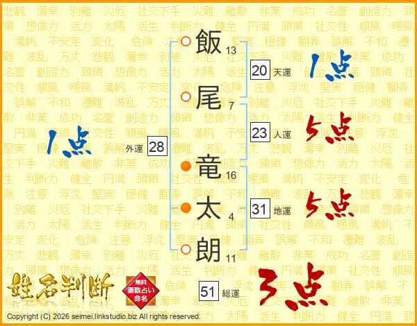 飯(13画)尾(7画) 竜(16画)太(4画)朗(11画)