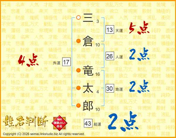 三倉竜太郎さんの総運は43画の2点!