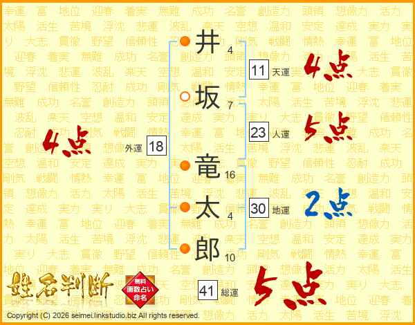 井(4画)坂(7画) 竜(16画)太(4画)郎(10画)