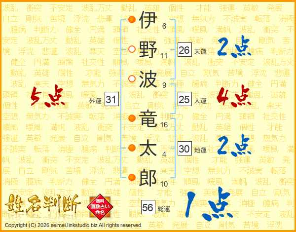 伊(6画)野(11画)波(9画) 竜(16画)太(4画)郎(10画)