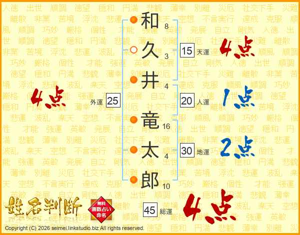 和(8画)久(3画)井(4画) 竜(16画)太(4画)郎(10画)
