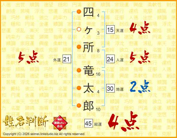 四(4画)ヶ(3画)所(8画) 竜(16画)太(4画)郎(10画)