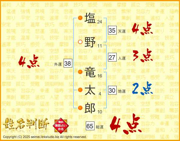 塩(24画)野(11画) 竜(16画)太(4画)郎(10画)