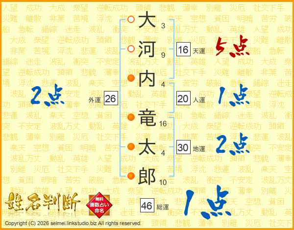 大(3画)河(9画)内(4画) 竜(16画)太(4画)郎(10画)