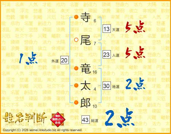 寺尾竜太郎さんの天運は13画の5点!