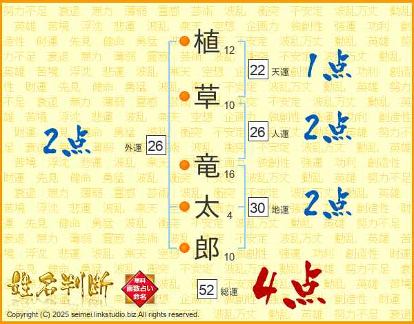 植(12画)草(10画) 竜(16画)太(4画)郎(10画)