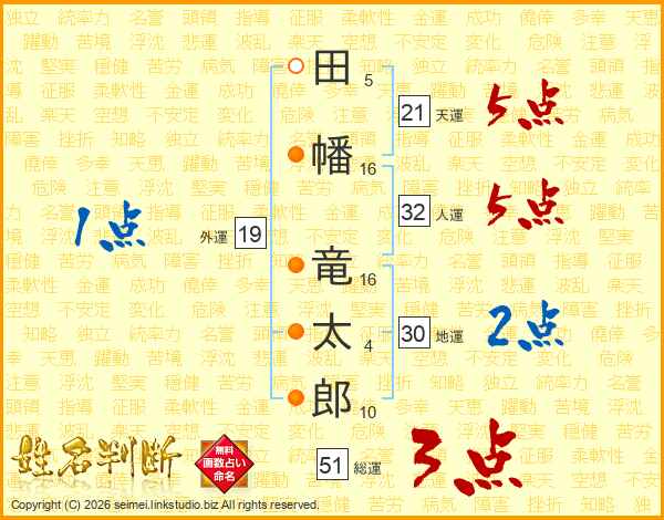 田(5画)幡(16画) 竜(16画)太(4画)郎(10画)