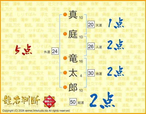 真(10画)庭(10画) 竜(16画)太(4画)郎(10画)