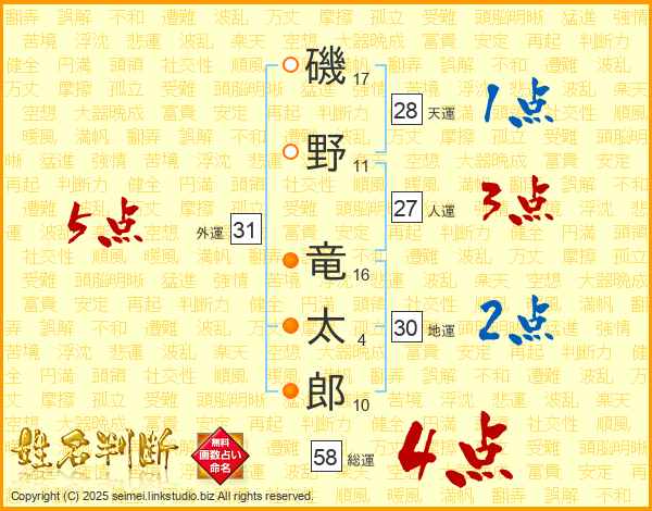 磯(17画)野(11画) 竜(16画)太(4画)郎(10画)
