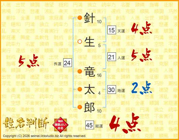 針(10画)生(5画) 竜(16画)太(4画)郎(10画)