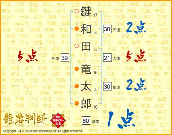 鍵(17画)和(8画)田(5画) 竜(16画)太(4画)郎(10画)