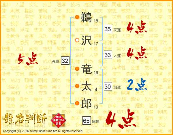 鵜(18画)沢(17画) 竜(16画)太(4画)郎(10画)