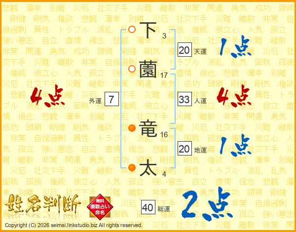 生活面を象徴する運勢です。外部から受ける影響力を表し、結婚運、家庭運や職場、環境への順応性を表します。総運から人運を引いた画数。姓や名が1文字の場合を除く。
