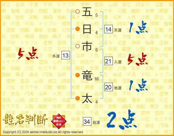 五(5画)日(4画)市(5画) 竜(16画)太(4画)