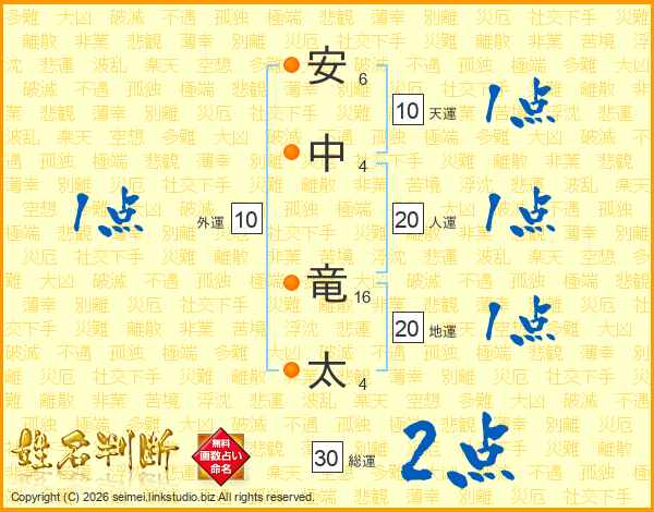 安(6画)中(4画) 竜(16画)太(4画)