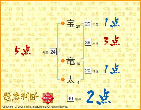 生活面を象徴する運勢です。外部から受ける影響力を表し、結婚運、家庭運や職場、環境への順応性を表します。総運から人運を引いた画数。姓や名が1文字の場合を除く。