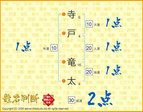寺(6画)戸(4画) 竜(16画)太(4画)