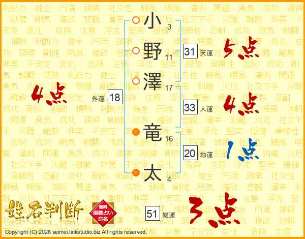 小(3画)野(11画)澤(17画) 竜(16画)太(4画)