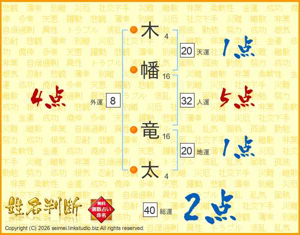 木(4画)幡(16画) 竜(16画)太(4画)