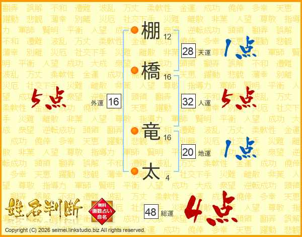 棚(12画)橋(16画) 竜(16画)太(4画)