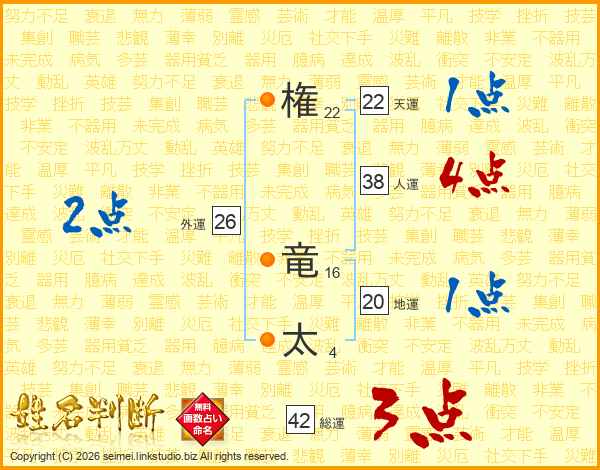 権(22画) 竜(16画)太(4画)