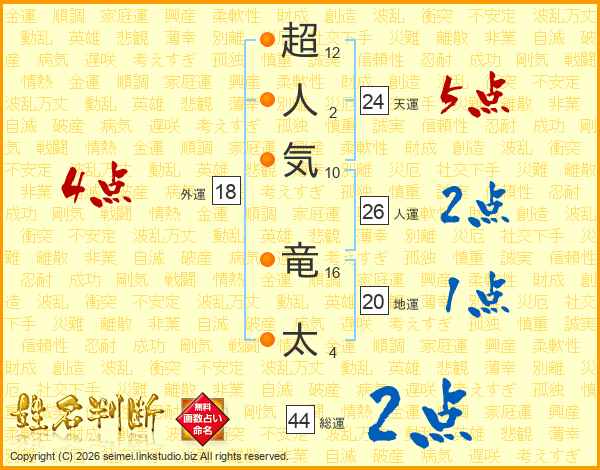 超人気竜太さんの総運は44画の2点!