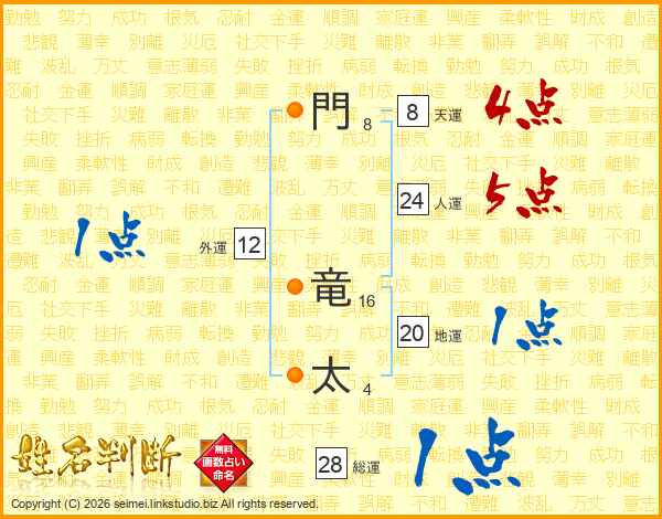 門(8画) 竜(16画)太(4画)
