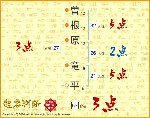 曽(12画)根(10画)原(10画) 竜(16画)平(5画)