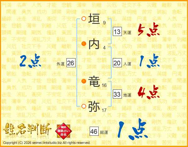 垣(9画)内(4画) 竜(16画)弥(17画)