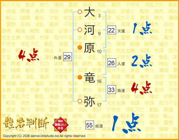 大(3画)河(9画)原(10画) 竜(16画)弥(17画)