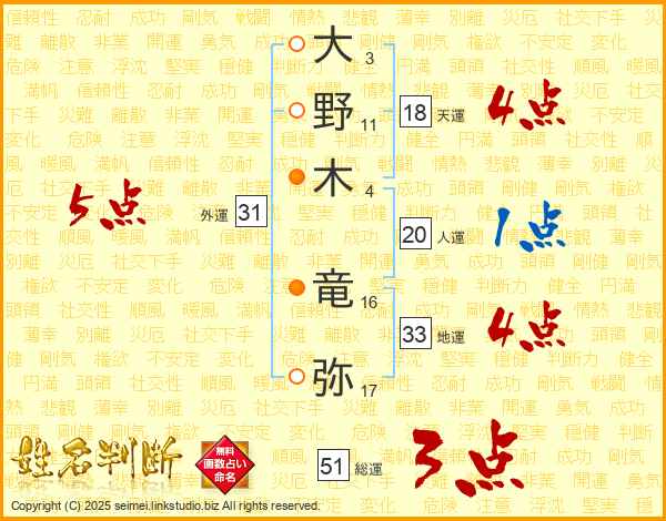 大(3画)野(11画)木(4画) 竜(16画)弥(17画)