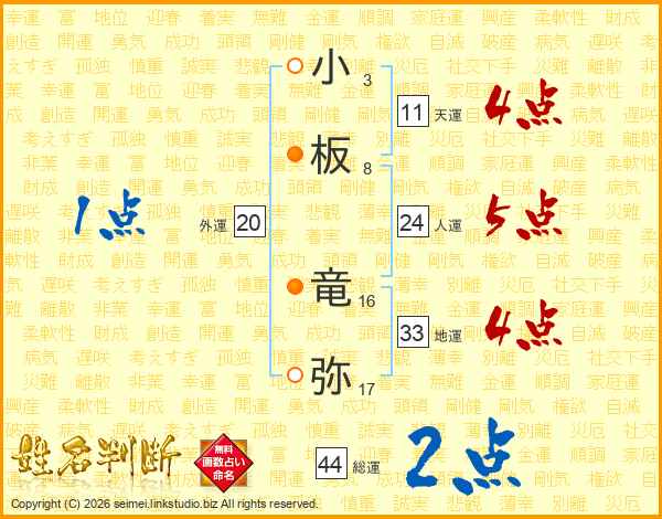 小板竜弥さんの総運は44画の2点!